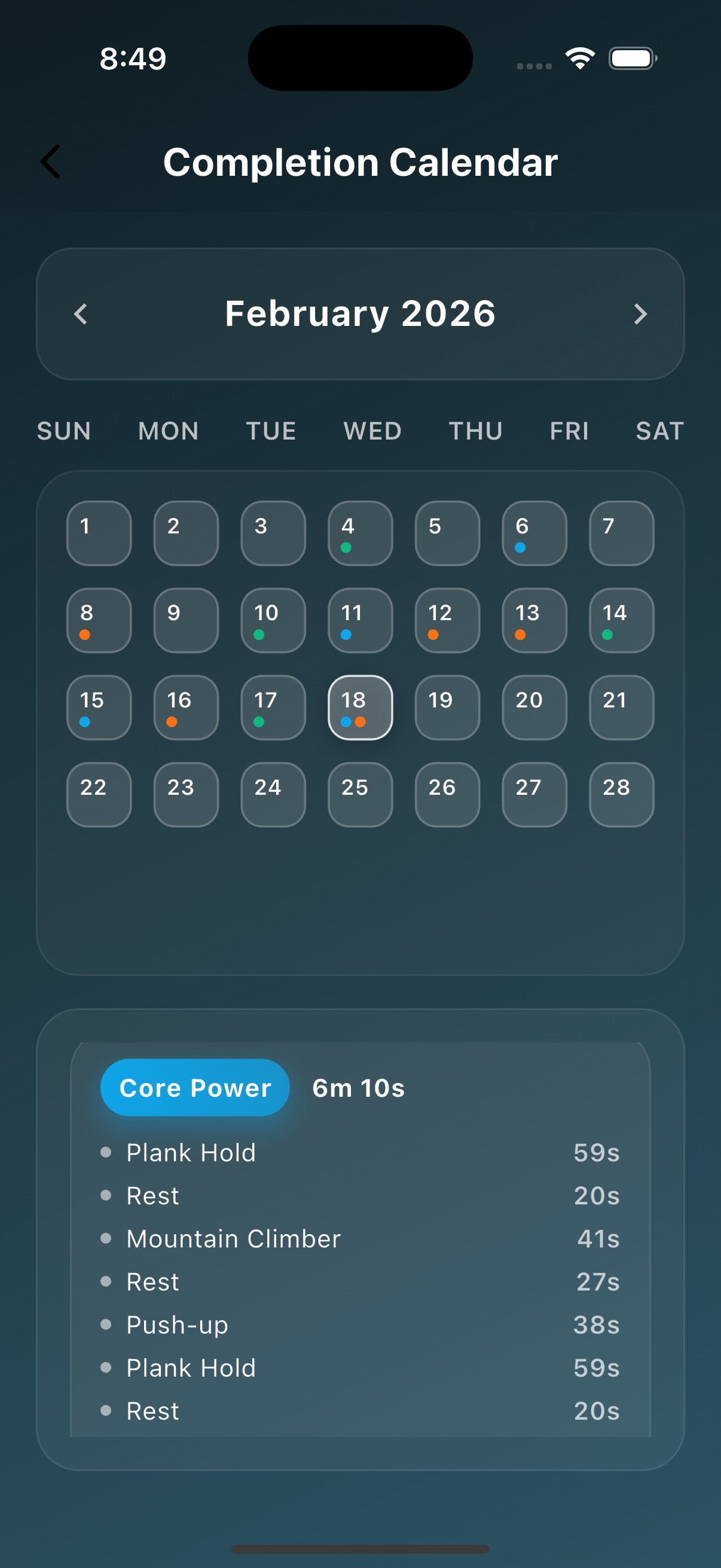Completion calendar tracking helps you review session history and maintain visible workout streaks over time.